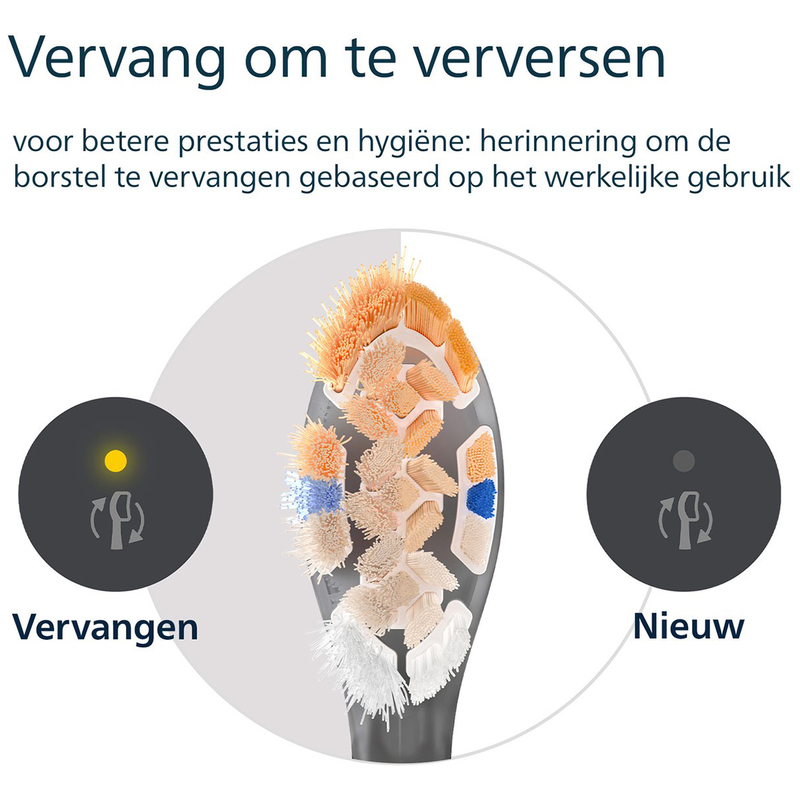 De zijborstelharen van de opzetborstel hebben extra bereik en poetsen de tandvleesrand voorzichtig, zelfs wanneer je zich concentreert op jouw tanden. Ook buigen de borstelharen mee om overmatige druk te compenseren.