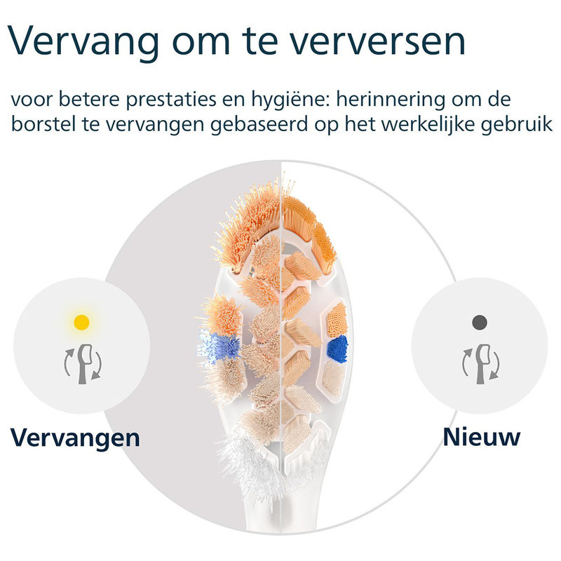 De zijborstelharen van de opzetborstel hebben extra bereik en poetsen de tandvleesrand voorzichtig, zelfs wanneer je zich concentreert op jouw tanden. Ook buigen de borstelharen mee om overmatige druk te compenseren.