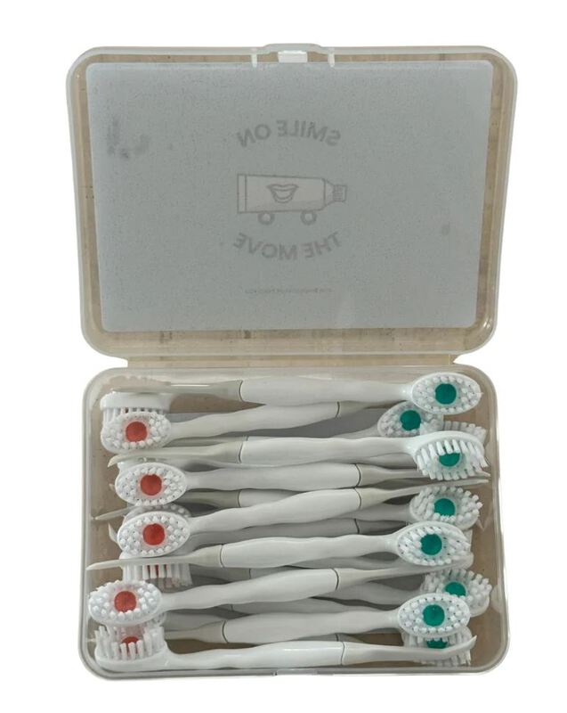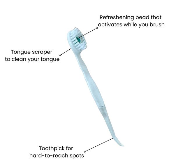 Deze handtandenborstel is speciaal ontworpen voor mensen die veel reizen of onderweg zijn. Het blijft ook niet alleen bij een tandenborstel maar bevat ook tandpasta, tongreiniger, en 2 tandenstokers in verschillende maten. Aan de achterkant van de tandenborstel vind u een tongreiniger om uw adem een frisse boost te geven. Ook zit er een klein bolletje met tandpasta op om dat frisse gevoel in de mond te krijgen en mocht u nou en stukje eten tussen de tanden hebben kunt u deze gemakkelijk verwijderen met de tandenstoker aan de achterkant.