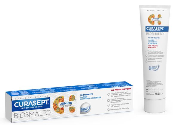 Curasept Biosmalto Cariës, Erosie & Slijtage Junior Tandpasta is speciaal ontworpen om optimaal te functioneren met betrekking tot het ontwikkelingsniveau van het gebit, omdat elke leeftijd andere behoeften heeft. Het Curasept Biosmalto assortiment is breed en begeleidt kinderen in hun groei naar volwassenheid met gedifferentieerde oplossingen voor leeftijd en concentraties van fluoride.