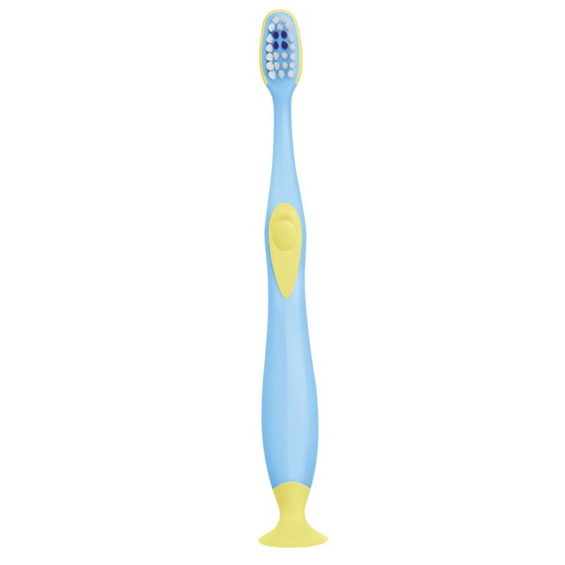 Het handvat is ergonomisch gevormd en voorzien van rubberen gripvlakken. Dit zorgt ervoor dat de borstel fijn in uw hand ligt terwijl u poetst, maar ook makkelijk vast te houden is door uw kindje als het zelf wil "oefenen".