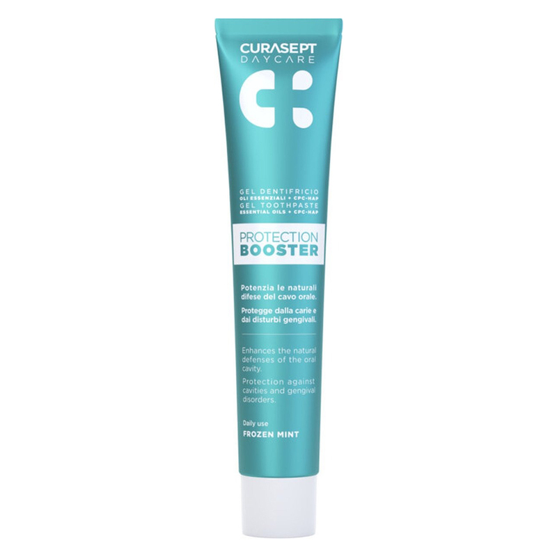 Curasept Daycare Protection Booster Tandpasta - Frozen Mint is van essentieel belang voor een verbeterde mondhygiëne. De geavanceerde samenstelling omvat een combinatie van CPC-HAP-complex (cetylpyridiniumchloride en hydroxyapatiet), NaF (natriumfluoride), essentiële oliën en is vrij van SLS. Bovendien heeft deze tandpasta een verfrissende Frozen Mint smaak!